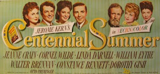 There's no Fox musical star in this Philadelphia family story. Jeanne Crain and Linda Darnell play the sisters who compete to win the heart of a Frenchman in the city to participate in the Centennial Exposition. Cornel Wilde stars as the Frenchman. The singing voices of all three performers were dubbed. However, Walter Brennan and Dorothy Gish, the former silent screen star and sister to Lillian Gish, did their own singing as the parents. This typical working class family must also prepare for a visit from the mother's ultra sophisticated and glamorous sister, deliciously played by Constance Bennett (sister of Joan Bennett). Constance Bennett gives the movie a nice champagne fizz as Aunt Zenia. Two young beautiful sisters bickering over a Frenchman. Their mom afraid her alluring single sister will lead her husband astray. It's not the enduring true Hollywood classic that Minnelli's poignant MEET ME IN ST. LOUIS is, but CENTENNIAL SUMMER keeps you entertained. It was directed by Otto Preminger. I learned of this film when I was kid thanks to my parents' jazz record collection. One of their favorite LPs to play was an album by Carmen McRae. On it, she sang a song called "In Love in Vain." On the liner notes, I read that it was written by Jerome Kern and Leo Robin for a movie called CENTENNIAL SUMMER. When I discovered the movie starred Linda Darnell and Jeanne Crain, I had to see it.